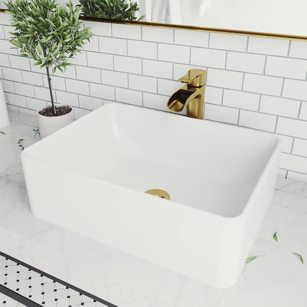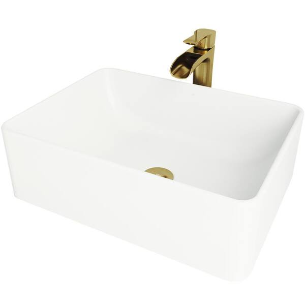 Matte Stone Amaryllis Composite Rectangular Vessel Bathroom Sink in White with Faucet and Pop-Up Drain in Matte Gold