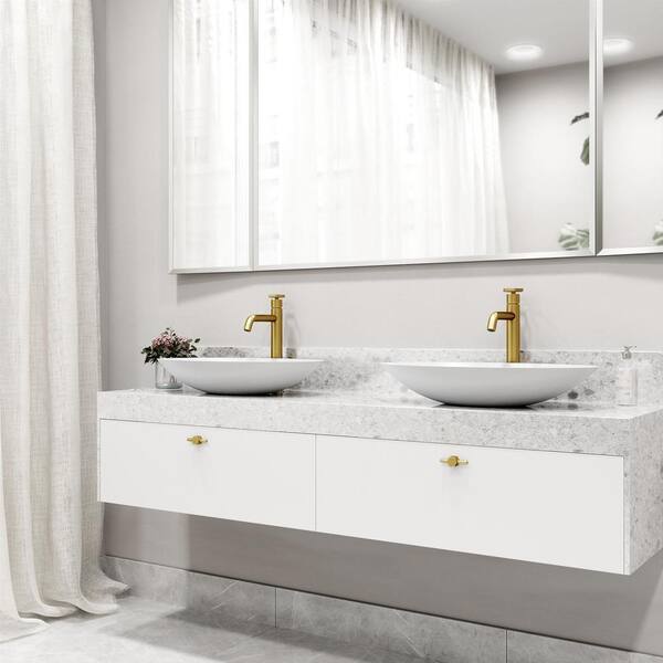 Matte Stone Wisteria Composite Oval Vessel Bathroom Sink in White with Ruxton Faucet and Pop-Up Drain in Matte Gold