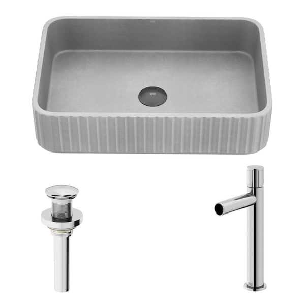 Windsor Gray Concreto Stone Rectangular Fluted Bathroom Vessel Sink with Ashford Faucet and Pop-Up Drain in Chrome
