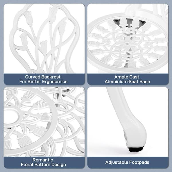 Tulip Design White 3-Piece Cast Aluminum Outdoor Bistro Set, Rust-Resistant Bistro Chairs and Table with Umbrella Hole