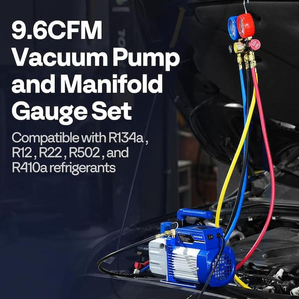110-Volt 1 HP 9.6 CFM Dual Stage HVAC Vacuum Pump and 4-Way AC Manifold Gauge Set Kit with Leak Detector