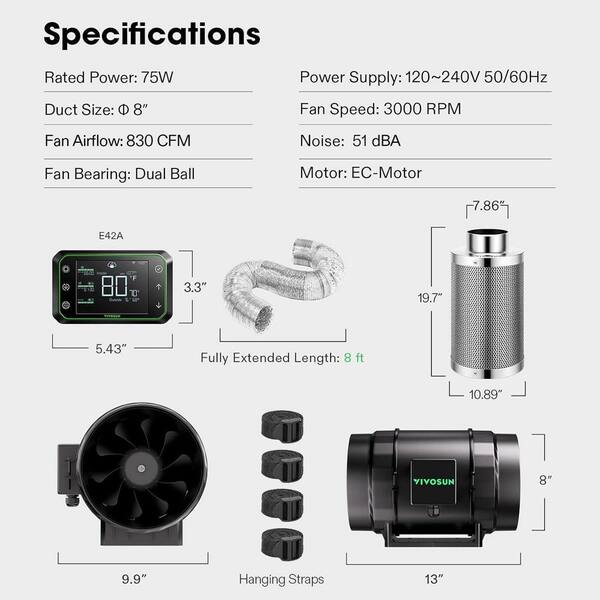 AeroZesh S8 8 in. Inline Duct Fan with GrowHub E42A Controller, Carbon Filter, 25 ft. Ducting Ventilation System