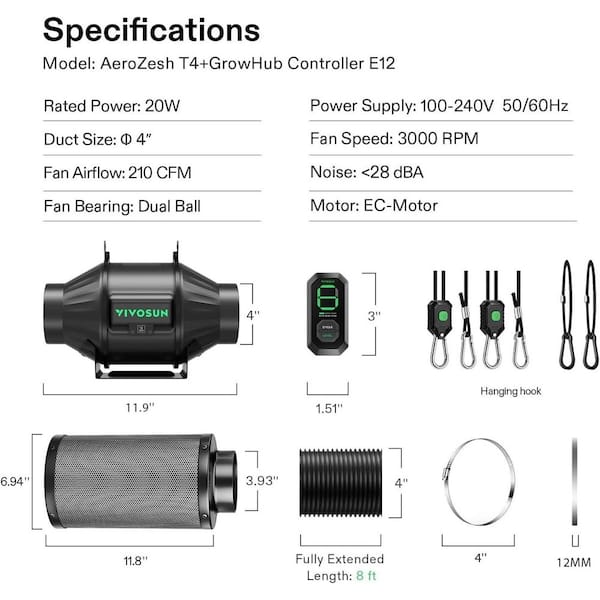 AeroZesh T4 4 in. 210 CFM Inline Duct Fan Kit with E12 Speed Controller, Black Carbon Filter and 8 ft. Ducting