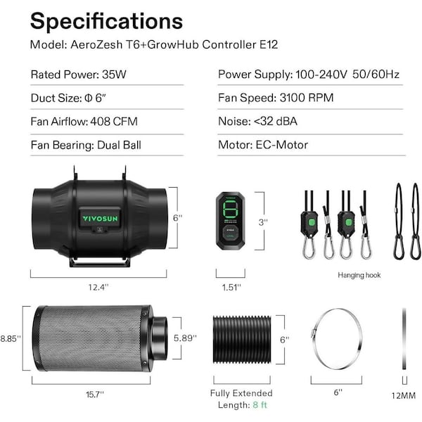AeroZesh T6 6 in. 408 CFM Inline Duct Fan with E12 Speed Controller, 6 in. Black Carbon Filter and 8 ft. Ducting
