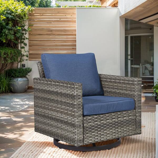 Valenta 1-Piece Gary Wicker Patio Swivel Chair Outdoor Rocking Chair with Blue Cushions