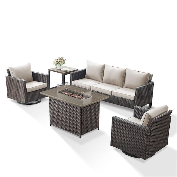 Valenta 5-Piece Brown Wicker Outdoor Conversation Swivel Chair Set Patio Fire Pit Seating Sofa Set with Beige Cushions