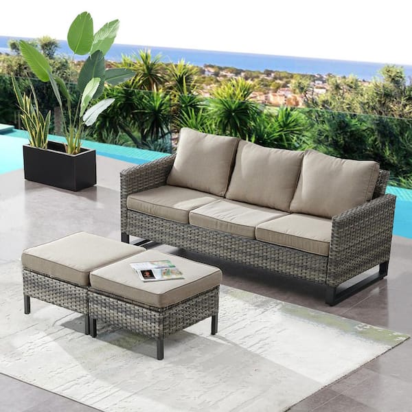 Valenta Gray Wicker 7-Piece Patio Conversation Sofa Set Outdoor Furniture Sectional Fire Pit Table and Gray Cushions