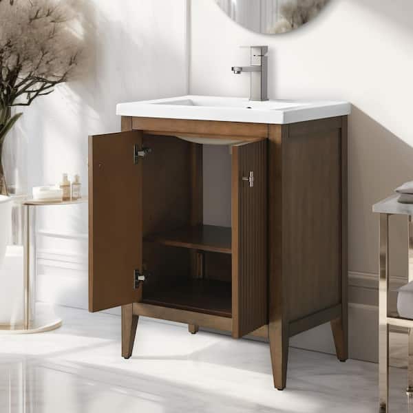 24 in. W x 18.5 in D x 34 in. H Single Sink Linear Walnut Bath Vanity Cabinet with White Ceramic Top