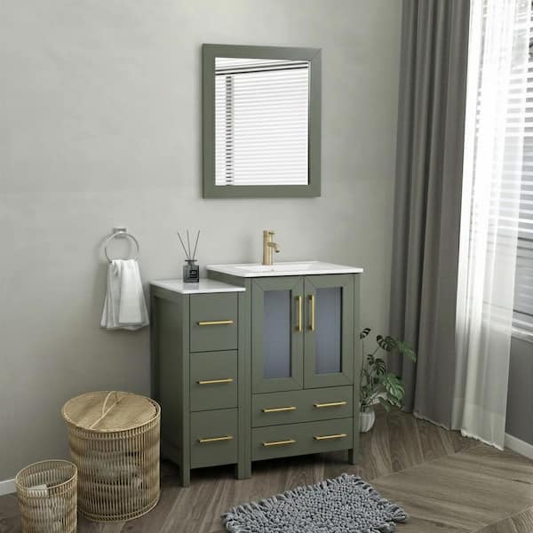 36 in. W x 18.1 in. D x 35.8 in. H Single Basin Vintage Green Bath Vanity with White Ceramic Top and Mirror