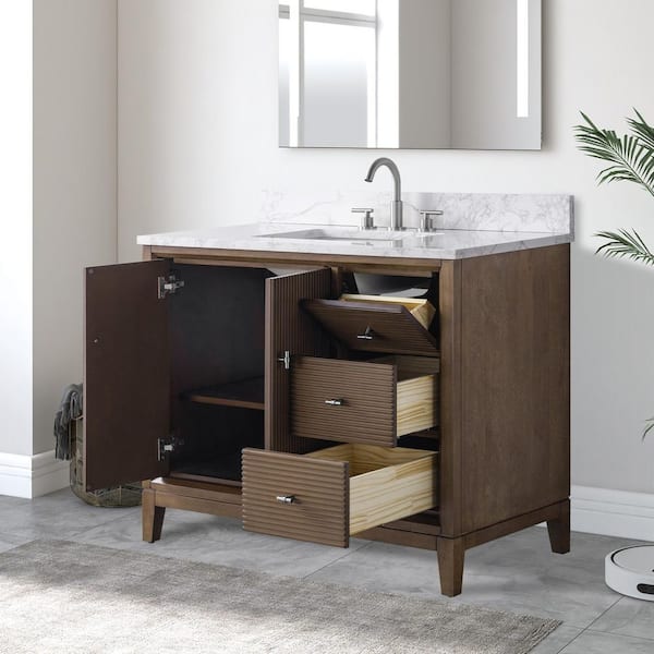 42 in. W Single Sink Freestanding Walnut Bath Vanity Cabinet with Arabescato White Engineered Marble Top