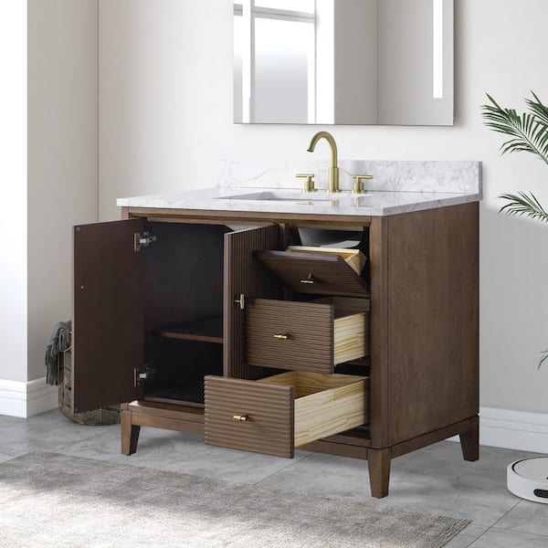 42 in. W x 34 in. H Single Sink Walnut Bath Vanity Cabinet with Arabescato White Engineered Marble Top