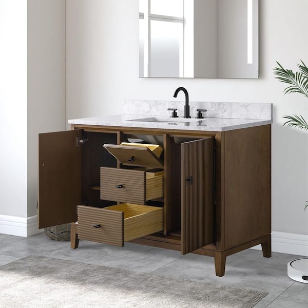 48 in. W x 22 in. D Single Sink Freestanding Walnut Bath Vanity Cabinet with White Engineered Marble Top