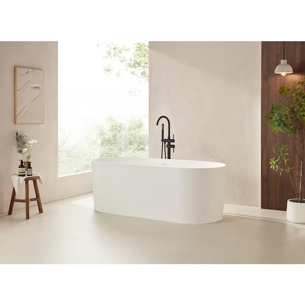 59 in. x 30 in. Freestanding Oval Soaking Stone Resin Bathtub in Glossy White with Pure White Overflow and Pop Up Drain
