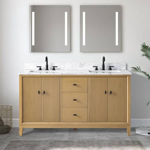 60 in. W x 22 in. D Double Sink Freestanding Natural Oak Bath Vanity Cabinet with White Engineered Marble Top