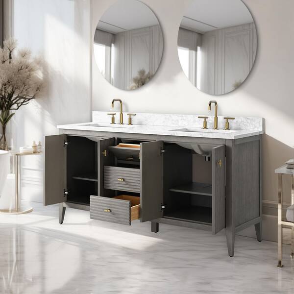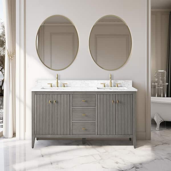 60 in. W x 22 in D x 38 in. H Double Sink Bath Vanity Cabinet in Linear Driftwood Gray with White Engineered Marble Top