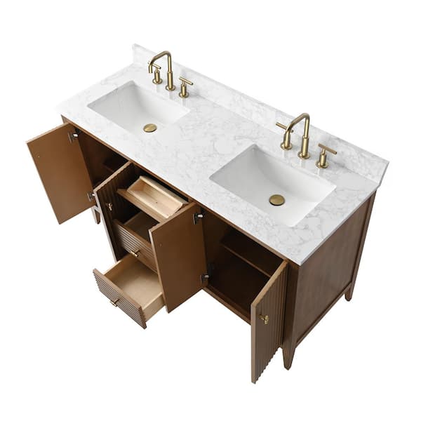 60 in. W x 22 in. D x 38 in. H Double Sink Bathroom Vanity Cabinet in Linear Walnut with Engineered Marble Top