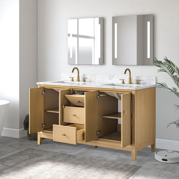 60 in. W x 34 in. H Double Sink Natural Oak Bath Vanity Cabinet with Arabescato White Engineered Marble Top