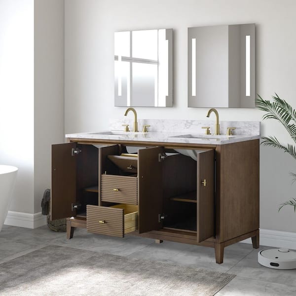 60 in. W x 34 in. H Double Sink Walnut Bath Vanity Cabinet with Arabescato White Engineered Marble Top