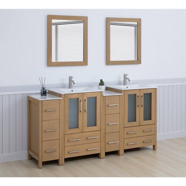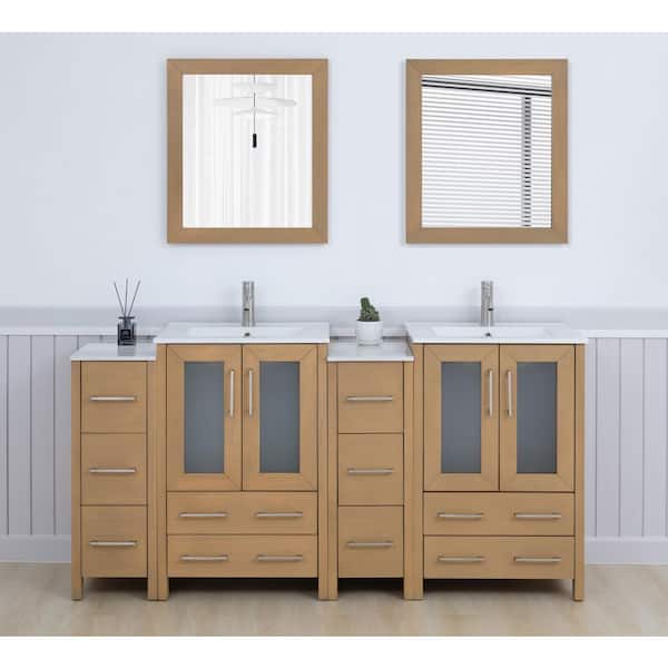 72 in. W x 18.1 in. D x 35.8 in. H Double Basin Natural Oak Bath Vanity with White Ceramic Top and Mirror