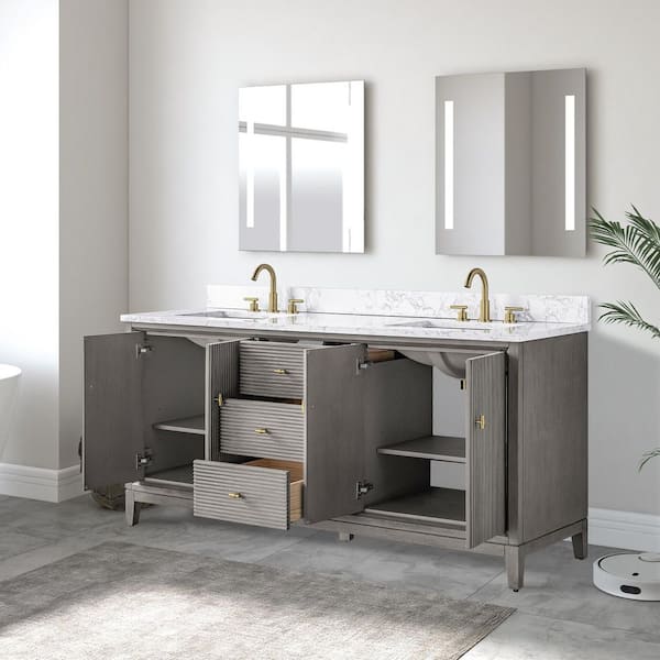 72 in. W x 34 in. H Double Sink Driftwood Gray Bath Vanity Cabinet with Arabescato White Engineered Marble Top
