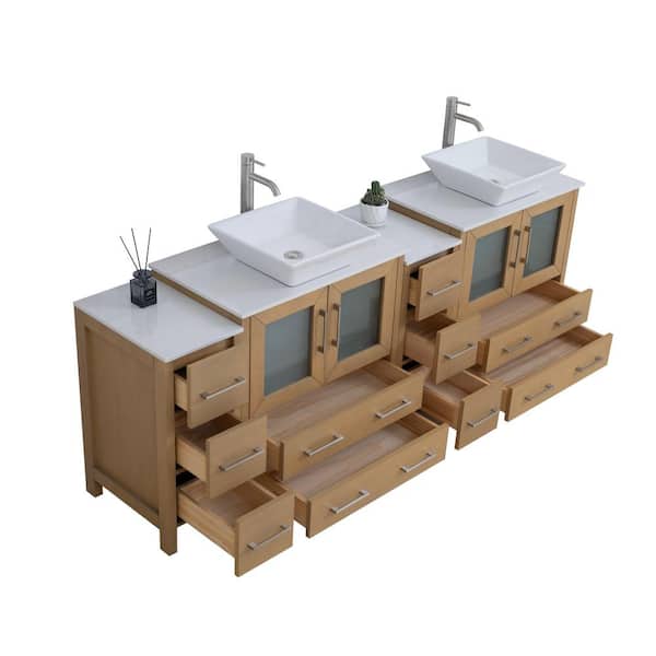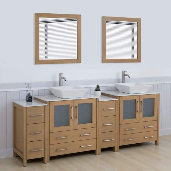 84 in. W Double Basin Natural Oak Bath Vanity with White Engineered Marble Top and Mirror