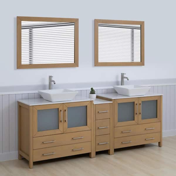 84 in. W Double Basin Natural Oak Bath Vanity with White Engineered Marble Top and Mirror