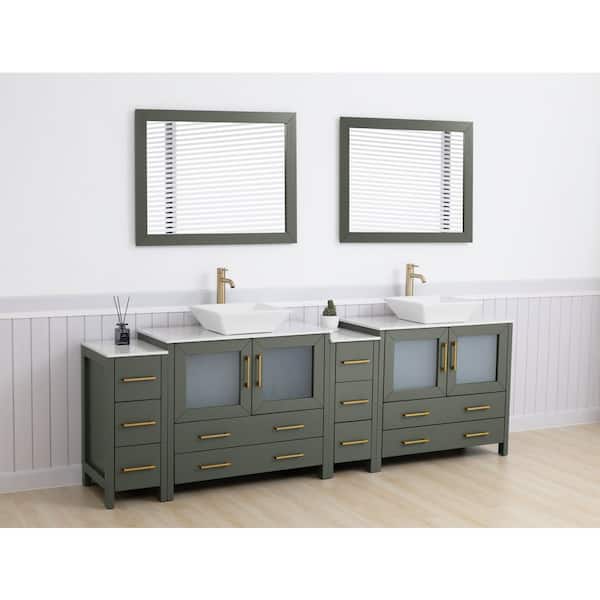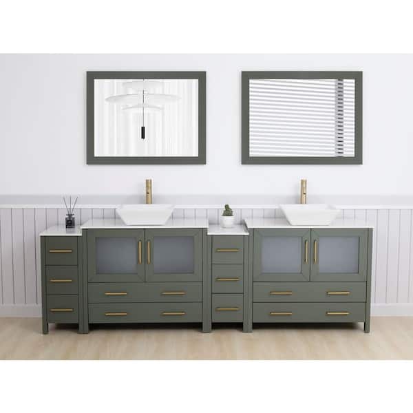 96 in. W Double Basin Vintage Green Bath Vanity with White Engineered Marble Top and Mirror