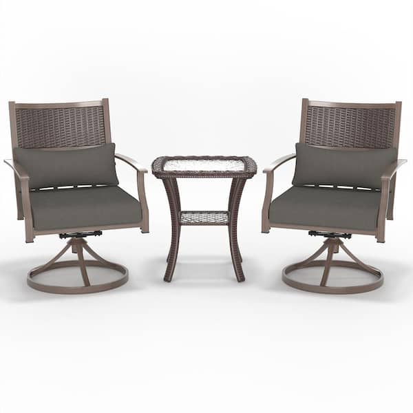 3 Pieces Swivel Rocker Outdoor Chairs Set, Patio Dining Chairs with Grey Thickened Cushions&Glass Top Table