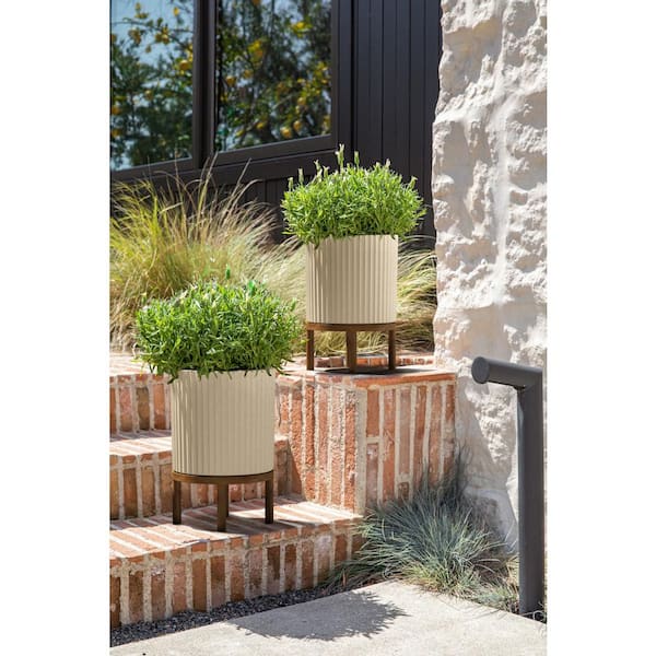 Demi Medium Sand Plastic Round Planter with Brown Stand and Drainage Holes (10.5 in. L x 10.5 in. W x 16 in. H) (2-Pack)