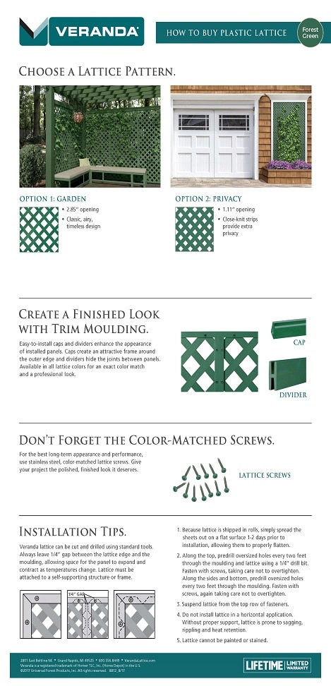For decades, lattice panels have been primarily used as an attractive, low-maintenance skirt around porches and decks. But over the past several years, builders, architects and homeowners have discovered lattice's amazing versatility, both inside the home and outdoors. Matching dividers, caps and screws (each sold separately) simplify installation and provide great-looking results. With so many possibilities for creative applications, every lattice project-indoors and out-turns out uniquely you.