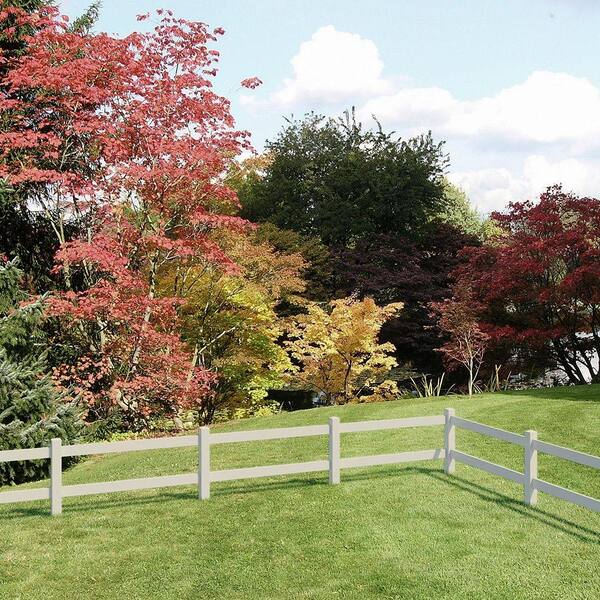 • Tan Ranch 2-Rail line post made of durable, low-maintenance vinyl