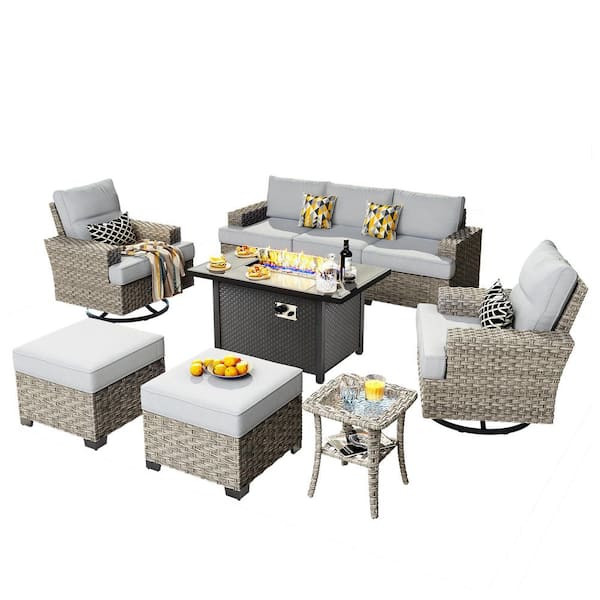 Verve 9-Piece Wicker Rectangular Fire Pit Sets and Swivel Rocking Chairs with Grey Cushion