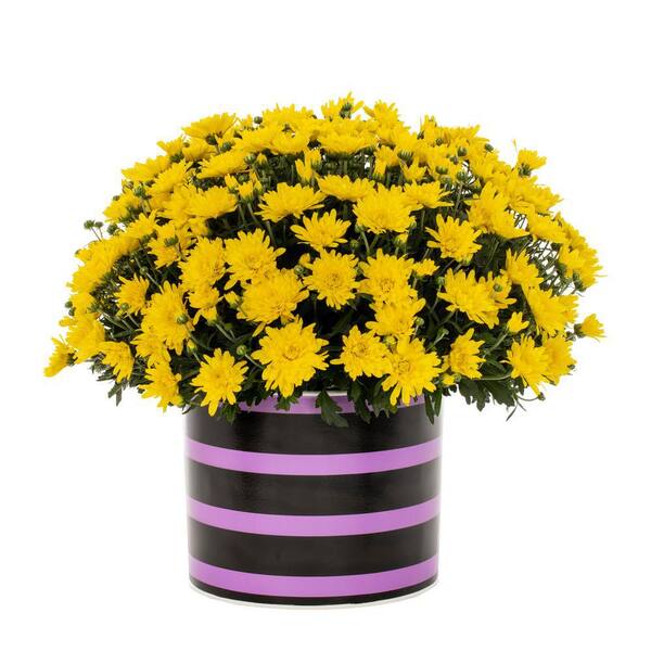 3 qt. Live Yellow Chrysanthemum (Mum) Plant for Fall Porch or Patio in Decorative Black and Purple Striped Tin (1-Pack)