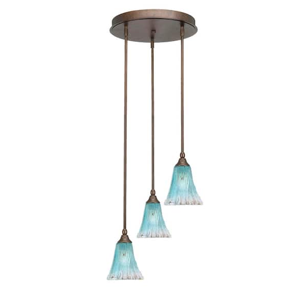 Villa 60-Watt 14.75 in. 3 Light Bronze Stem Pendant Light with 5.5 in. Teal Crystal Glass Shade No bulbs included