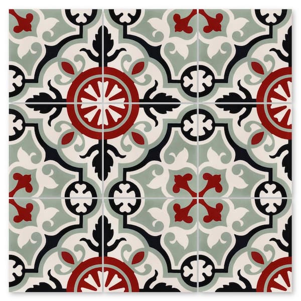 Vienna Bloom in Sand Dollar, Black, Gray Green, and Bold Brick/Matte 8 in. x 8 in. Cement Handmade Tile Sample
