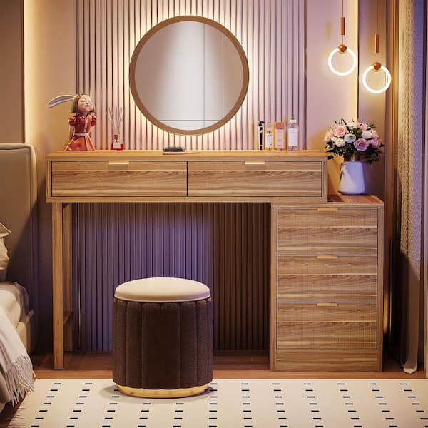 Vintage Walnut Brown Dressing Makeup Vanity Desk with 5-Drawers for Bedroom, Living Room
