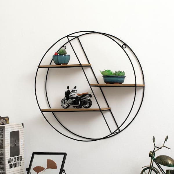 Elegant 3-Tier Decorative Floating Silhouette Wall Shelf Metal Black Frame and Wood Brown Shelves, 17 in. W x 4 in. D
