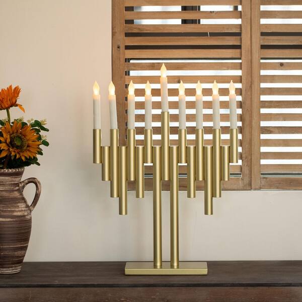 Modern 9-Branch Hanukkah Menorah with LED Candles in Sleek Finish, Contemporary Centerpiece and Gift, Gold