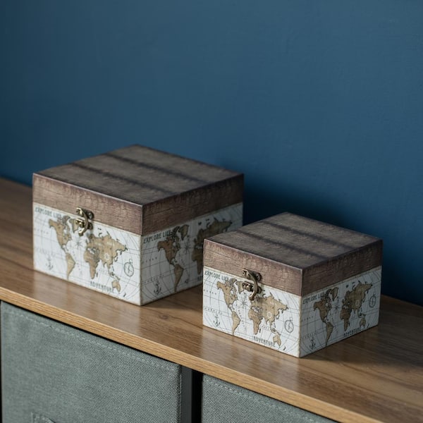 Set of 2 Antique Vintage Style World Map Design Wooden Storage Box Trunk