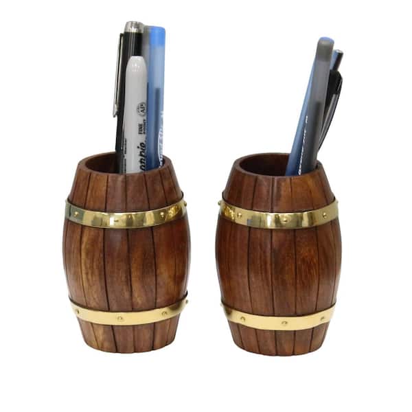 Set of Two Decorative Wine Barrel Shaped Wooden Pen Holders for Office Desk, or Entryway