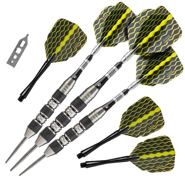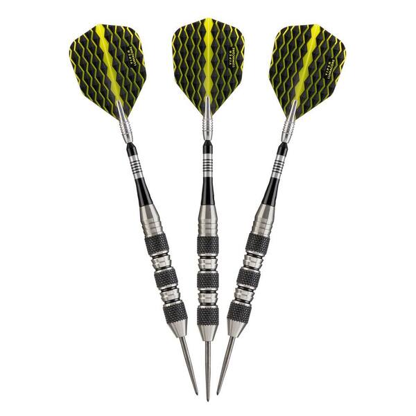 The Freak 22 g Black and Yellow Knurled and Shark Fin Barrel Steel Tip Dart Set