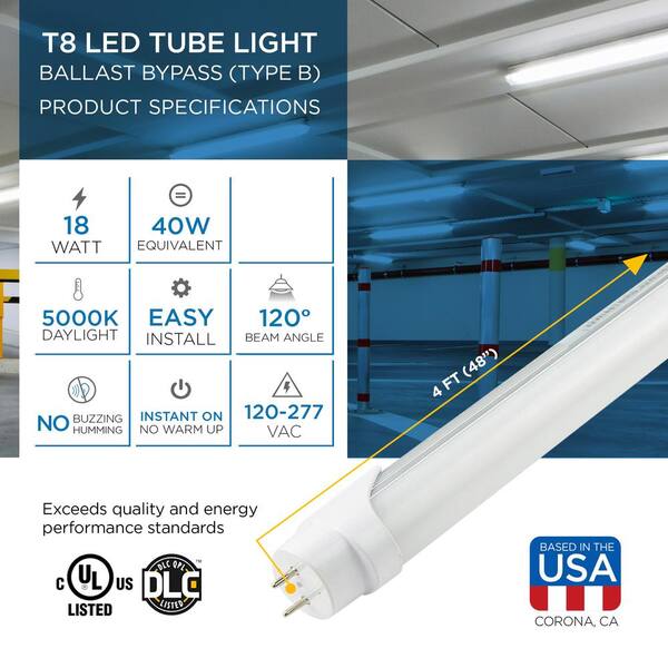 20W T8 LED Tubes 5000K 2000lm 4 Foot Milky Cover 90+ CRI Ballast Bypass - 4 Pack