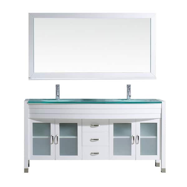 Ava 63 in. W Bath Vanity in White with Glass Vanity Top in Aqua Tempered Glass with Round Basin and Mirror