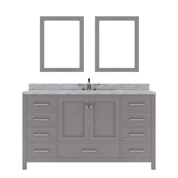 Caroline Avenue 60 in. W Bath Vanity in Gray with Marble Vanity Top in White with Round Basin and Mirror