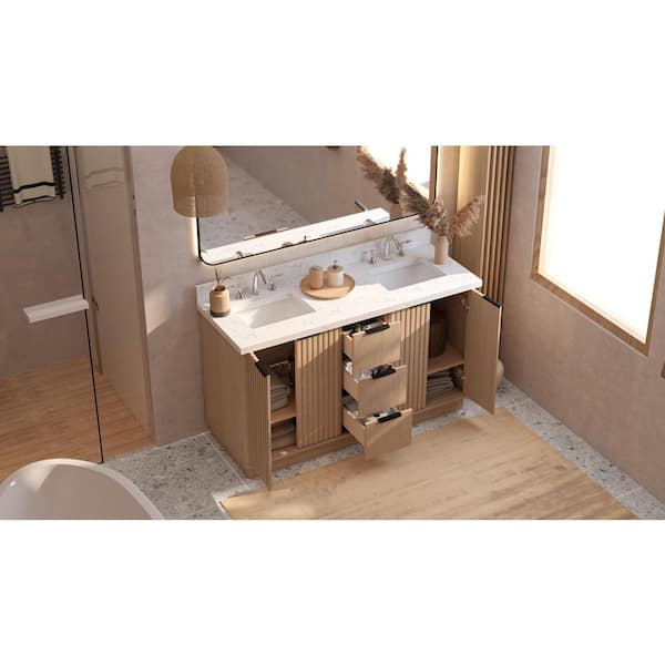 Kathryn 60 in. Double Freestanding Bath Vanity in Light Oak with Statuario Venato Marble Quartz Top and Square Sinks