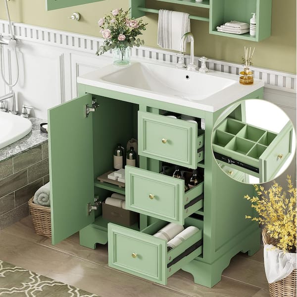 30 in. W Single Sink Bath Vanity in Green with White Ceramic Top, 3-Drawers and Adjustable Shelf Unassembled