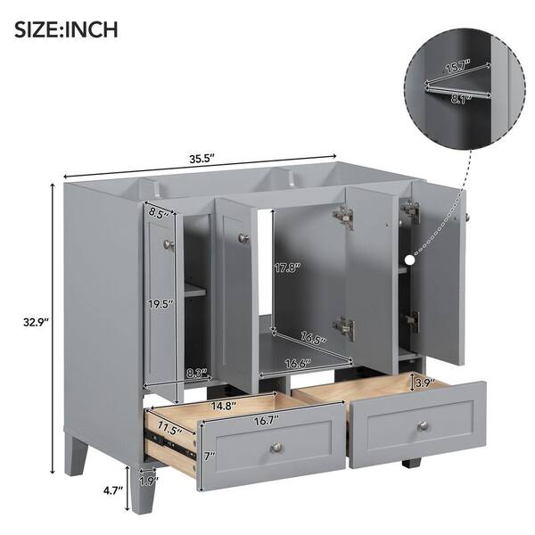 35.5 in. Solid Wood Frame Bath Vanity Cabinet without Top in Gray with 4-Soft Closing Doors and 2-Drawers