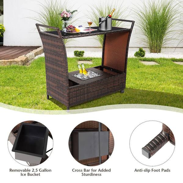 Black Rattan Bar Serving Cart in Brown Kitchen Cart with Glass Top and Handle