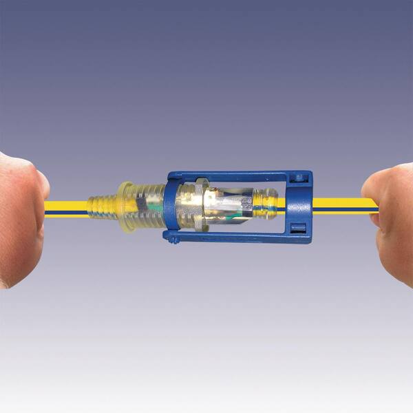 100 ft. 12/3 SJTW Outdoor Extension Cord with E-Zee Lock and Lighted End, Yellow with Blue Stripe