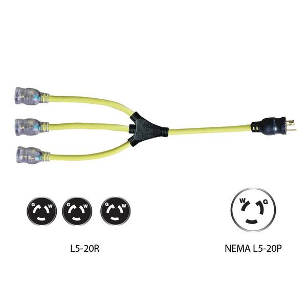 • Converts L5-20P plug to 3-lighted L5-20R receptacles